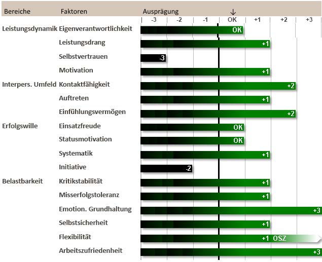 - 17 Faktoren in den Bereichen Leistungsdynamik, Erfolgswille, Belastbarkeit, Interpersonelles Umfeld (Umgang mit Anderen)