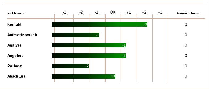 - 6 für jeden Verkaufsprozess typische Faktoren: Kontakt, Aufmerksamkeit, Analyse, Angebot, Prüfung, Abschluss