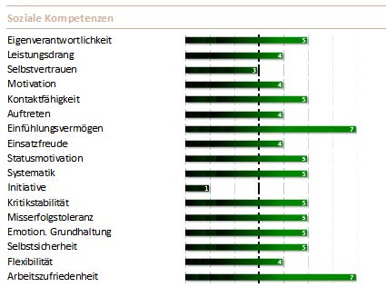 - u.a.: zu Eigenverantwortlichkeit, Motivation, Kontaktfähigkeit, Auftreten, Initiative, Systematik, Misserfolgstoleranz